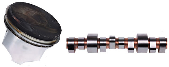The piston crown contains normal carbon, while the rings remain clean and functional. Note the absence of wear or scuffing on the piston skirt. The camshaft shows little-to-no scoring, bluing or wear after 3,000 miles of high-performance racing.